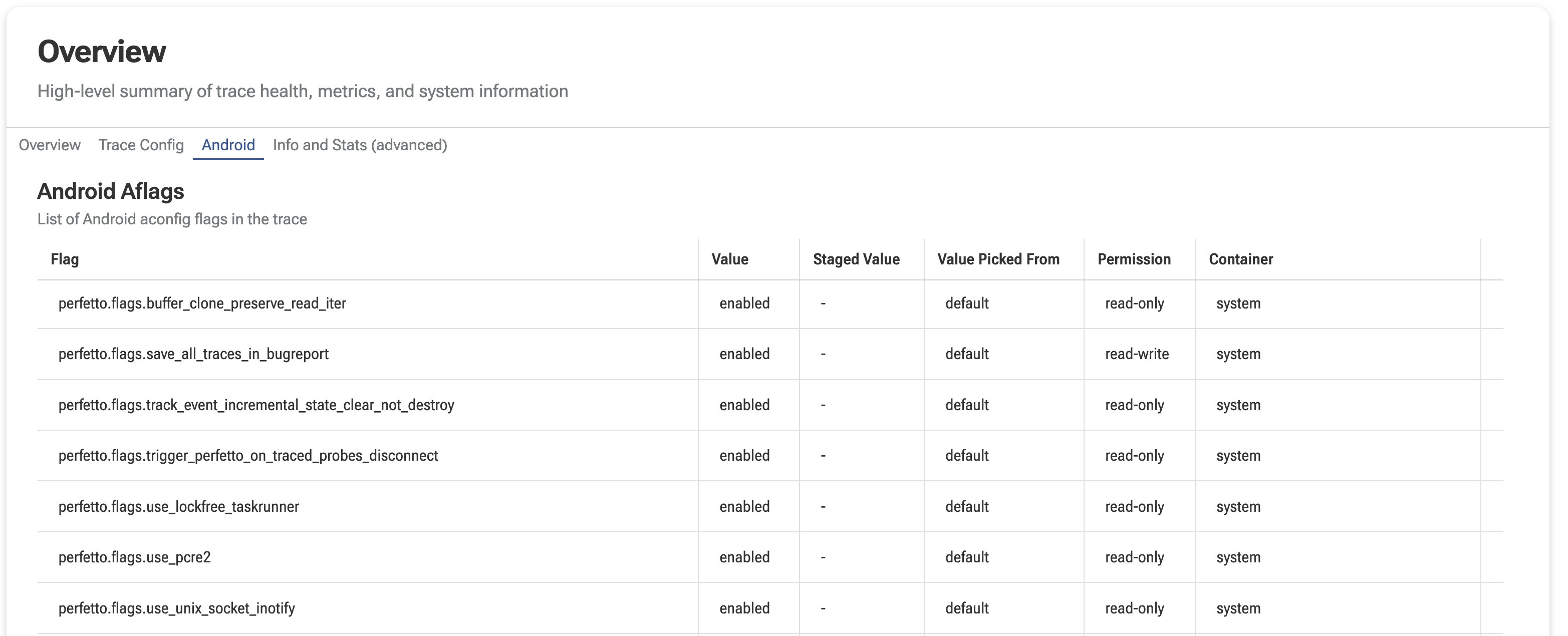 This allows you to record, for any given trace, which feature flags were active on the device and what value they had. It is useful when comparing traces taken across different builds, or when a behavior change is only explainable by an in-flight flag rollout.