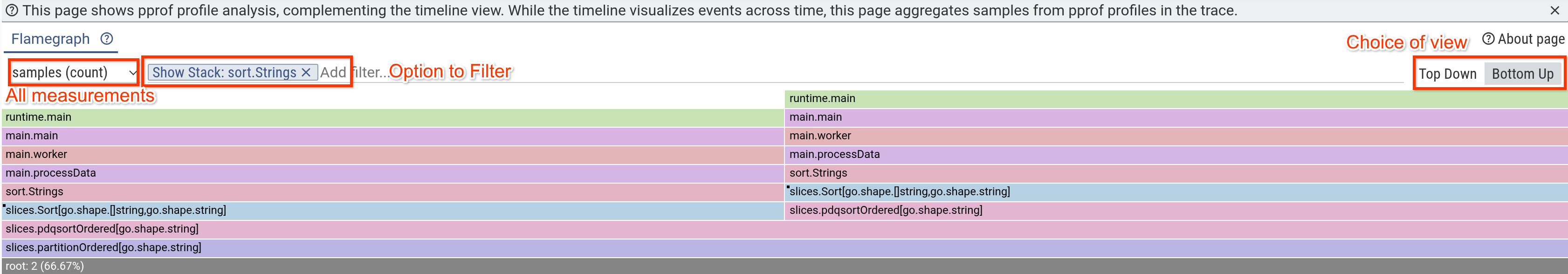 pproffile is opened, Perfetto visualizes the profiling data as an interactive flamegraph. If thepproffile contains multiple metrics (e.g., CPU time and memory allocations), the UI allows you to switch between them, displaying a separate flamegraph for each metric. This enables intuitive analysis of call stacks and helps identify performance hotspots across different dimensions.Here's an example of what that looks like